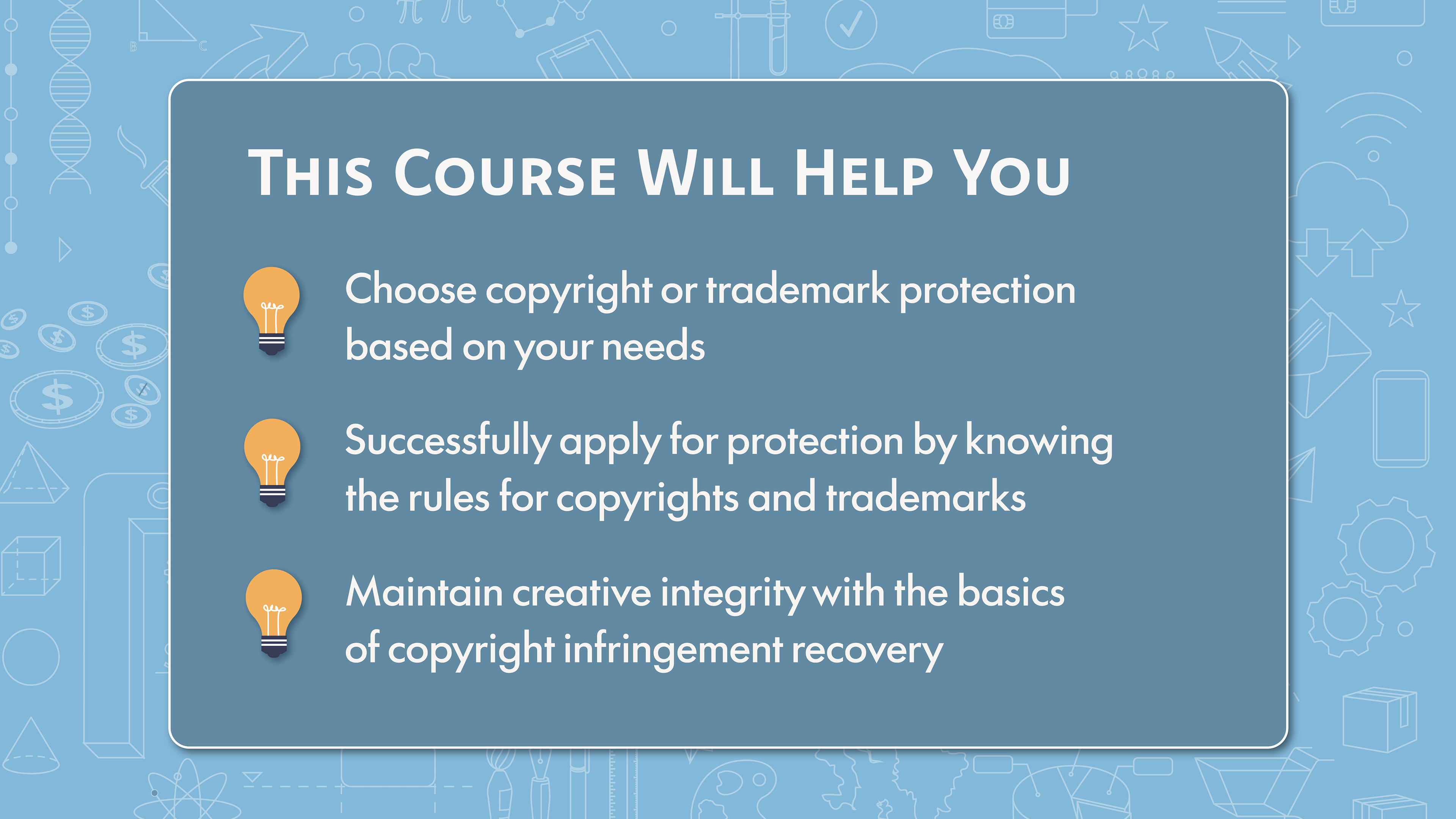 This company needed visuals for an educational course about Intellectual Property, to disseminate to employees and potential clients. Using the course concepts, I created a custom stylesheet and delivered animatable designs for production.